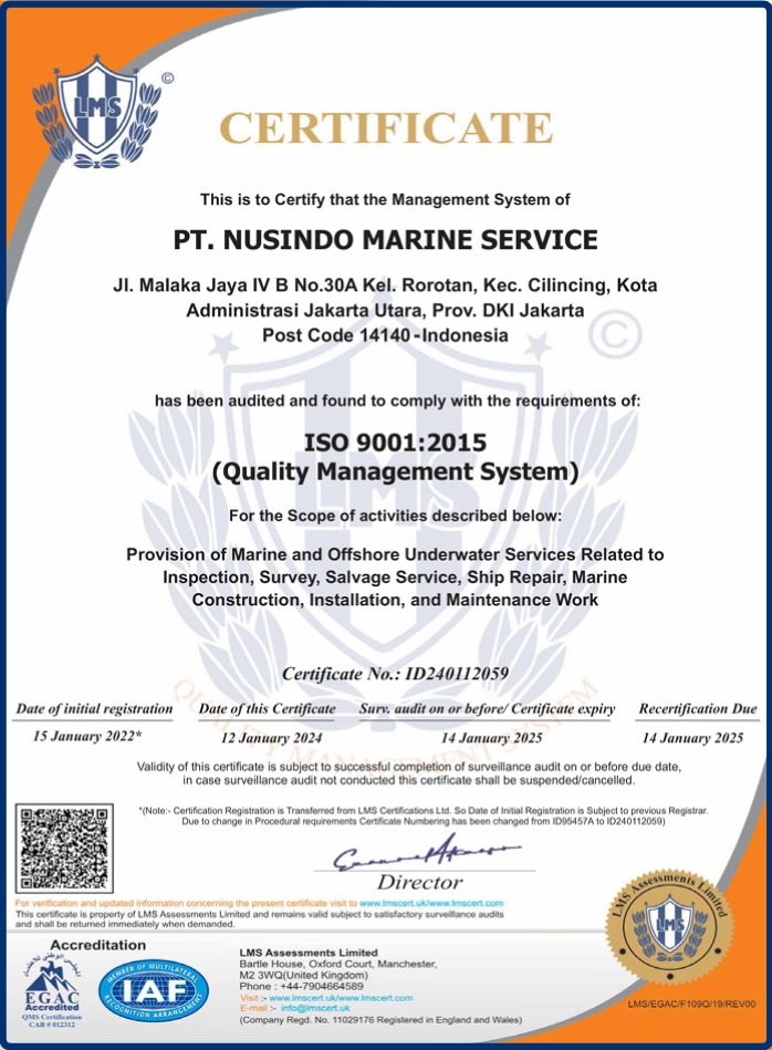 Established in 1997 at Jakarta, PT. Nusindo Marine Service (NMS) is an Indonesian private company engaged in the special field of underwater salvage and is authorized by the Government of the Republic of Indonesia.