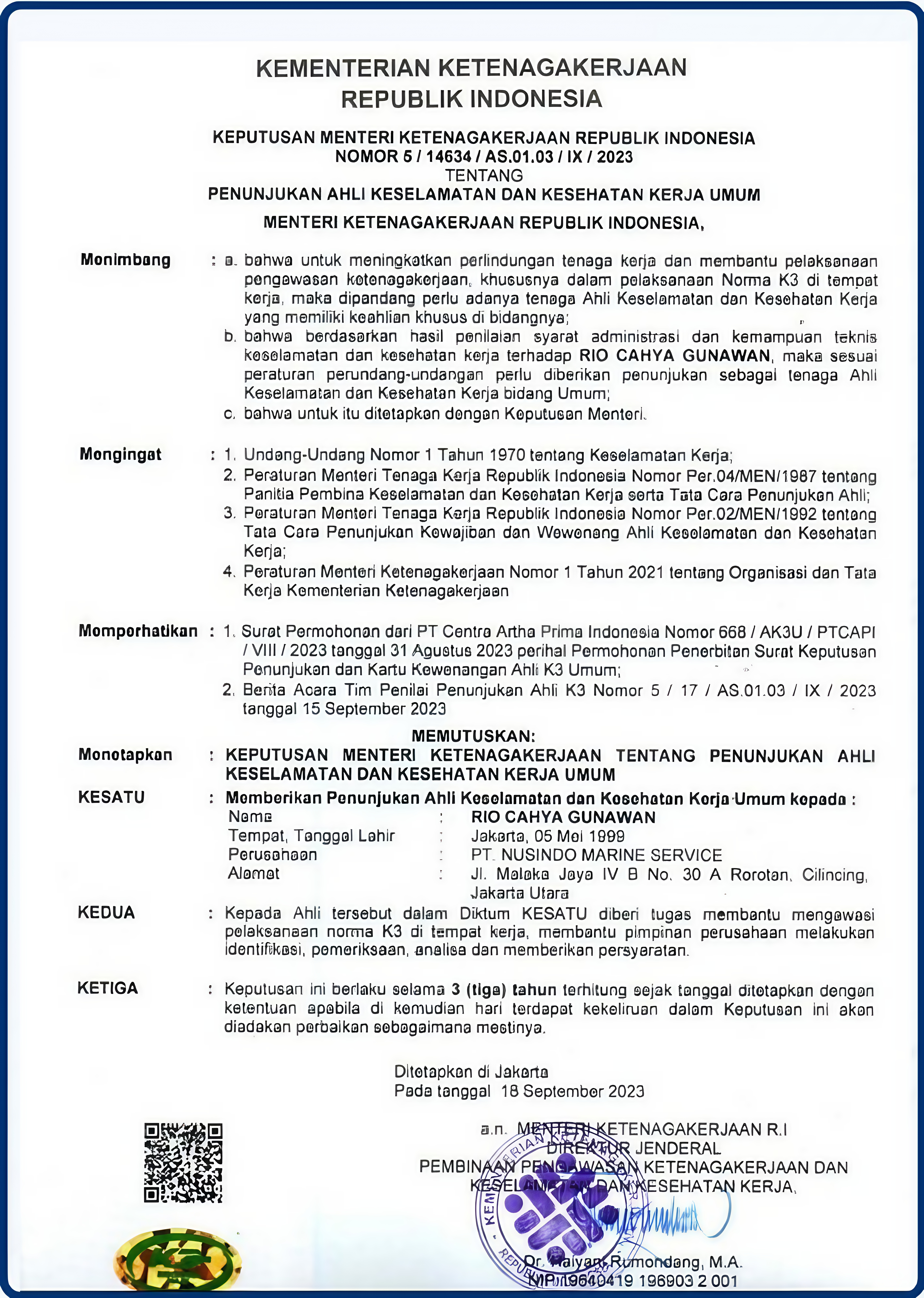 • 4. Implement working safety standards in accordance with the provisions of K3. (Kesehatan dan Keselamatan Kerja).