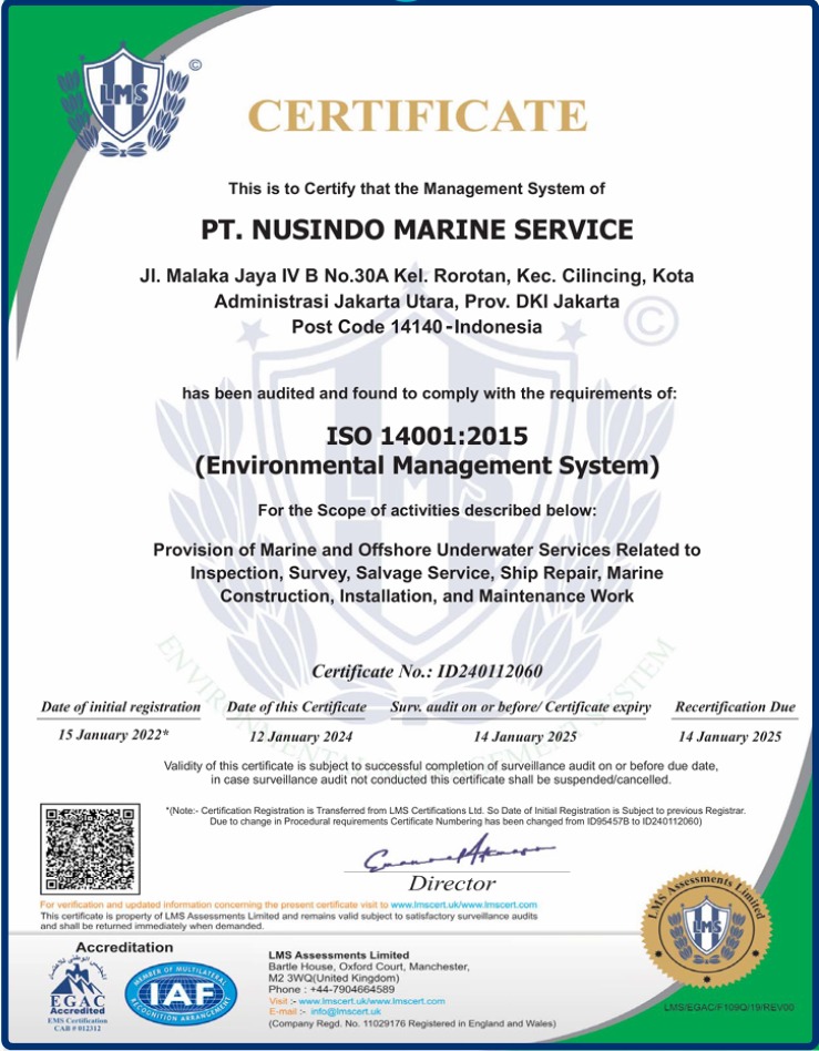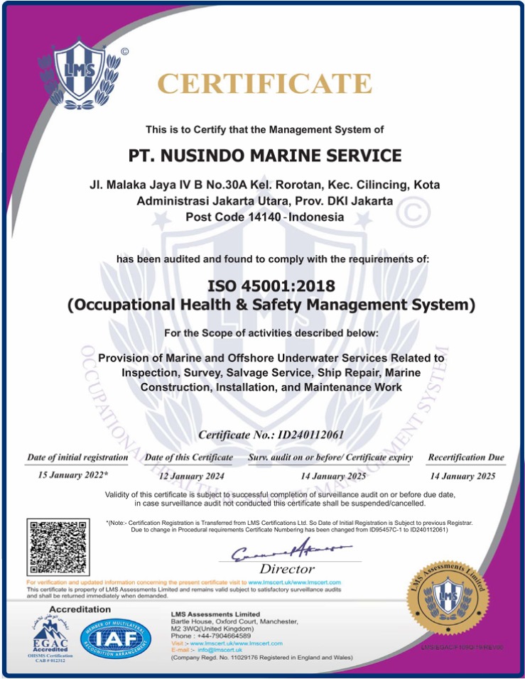 Established in 1997 at Jakarta, PT. Nusindo Marine Service (NMS) is an Indonesian private company engaged in the special field of underwater salvage and is authorized by the Government of the Republic of Indonesia.
