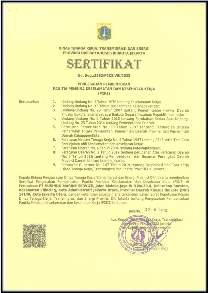 • Nusindo Marine Service Company was taken over by a new owner in September 2021, resulting in a change of leadership, organizational structure, and address. The new directors, led by Sukarman, S.T.